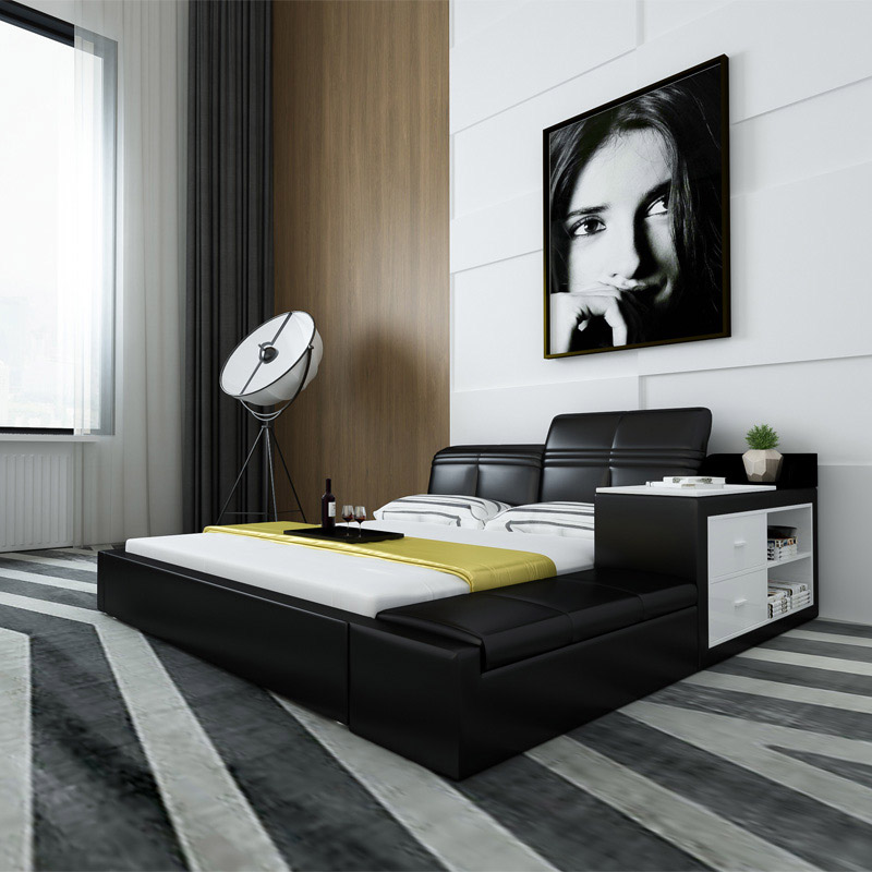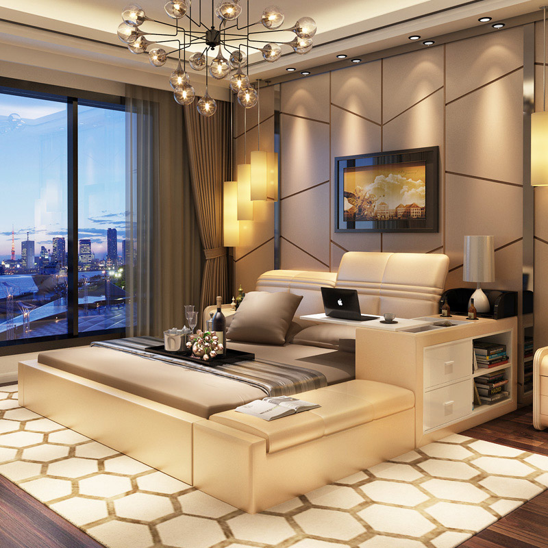 商品名称:创意真皮床双人床现代婚床1.8米1.5榻榻米床储物床皮艺床软床大床 床侧储物 升降靠背 双ll价格 更低